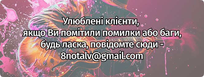 Магазин музичних інструментів «8 Нота» відчинив свої двері 7 серпня 2005 року і відразу ж «увірвався» на музичний ринок Львова. За ці роки ми завоювали довіру своїх клієнтів, набули друзів, побудували міцні відносини з діловими партнерами. В нас працюють продавцями–консультантами діючі львівські музиканти. Намагаємось бути кращими у всьому: дисконтна система для клієнтів, новинки, знижки, акції, майстер-класи. Залишаємось відкритими для всіх і щодня! Нашими клієнтами є музиканти відомих українських гуртів:  O.Torvald, Latexfauna, Арсен Мірзоян, Melovin, Друга Ріка, DZIDZIO, Брати Гадюкіни, Рімейк, Каділак, Free Breath, Рокаш, Барви блюзу, Власний простір, Ірій, Glory Box, Niagara, Black Jack та багато інших. Ми надамо кваліфіковану допомогу у виборі музичного інструмента. Завітайте до нас і знайдіть свою 8-му ноту в світі музики!