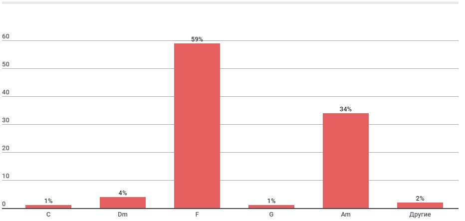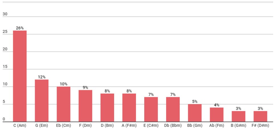 Первым вопрос, на который хотел ответить Карлтон, звучал так: «Правда ли, что некоторые аккорды и тональности в песнях используются чаще других?». Найти ответ на этот вопрос оказалось довольно сложной задачей, поскольку песни пишутся в разных тональностях: композиции в тональности C # часто используют аккорд C #, тогда как песни в тональности G чаще встречается аккорд G. Но поскольку написать композицию в тональности G гораздо проще, аккорд G оказался более популярным чем C #. Поняв это, Карлтон для начала решил выделить самые популярные тональности современной музыки. С(Am) - 26%, G(Em) -12%, F(Dm) - 10%, D(Bm) и A(F#m) - 8%...