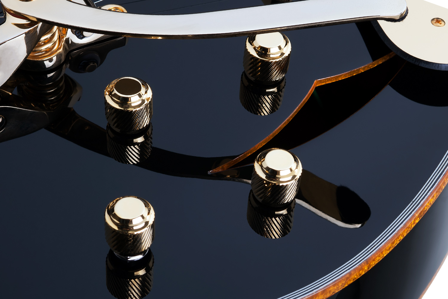 Характеристики: Цвет: Gloss Black (BLK) Крепление грифа: Set-Neck Материал корпуса: Клен Материал грифа: Клен из 3-х кусков Накладка грифа: Черное дерево Окантовка: Золотая Ладовые отметки: Перламутровые блоки Мензура: 24.75” (628мм) Лады: 22 X-Jumbo Радиус грифа: 12” (305мм) Форма грифа: Thin ‘C’ Размеры ладов: 1-й лад- .826” (21 мм)/ @ 12-й лад- .866” (22мм) Порожек: Graph Tech XL Ivory Tusq Ширина порожка: 1.693" (43 мм) Анкер: Двойной, регулируемый, с 4 мм анкерным болтом Бридж: Bigsby Archtop B70 w/ Roller TonePros TOM TPFR – T3BT Звукосниматель бридж: Tesla FilterTron TV-ML1 Звукосниматель нэк: Tesla FilterTron TV-ML1 Регуляторы: 2 громкости/2 тона (push-pull)/3-х позиционный переключатель Цвет фурнитуры: Золотая Колки: Grover