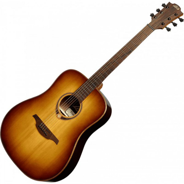 Lag Tramontane T118D-BRS – это шестиструнная акустическая гитара в корпусе дредноут. Эта модель обладает богатым внешним видом, а самое главное, отличным звуком, который достигается благодаря сочетанию цельной древесины кедра (верхняя дека) и и хайи (обечайки и нижняя дека). Гриф также сделан из тропической хайи и имеет качественную накладку из коричневого BrankoWood. Верхний и нижний порожки сделаны из черного графита и имеют размеры соответственно 43 и 72 мм. Мензура гитары составляет 650 мм. На грифе имеется 20 ладов. Также гитара может похвастаться двухсторонним анкером, закрытыми колками (Die-cast) и логотипом на голове грифа. Модель представлена в коричневом цвете (Brown Shadow) с глянцевым покрытием.