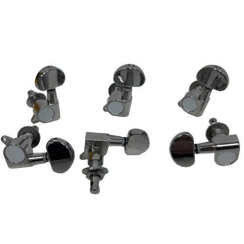 Колки закрытого типа для 6-струнной акустической или классической гитары представляют собой важную составную часть гитары, ответственную за передачу звуковых колебаний от струн к гитарному корпусу. Эти колки изготовлены из металла и хромированы, что не только придает им эстетический вид, но и обеспечивает защиту от коррозии, повышая продолжительность их использования. Металлические хромированные колки очень популярны среди гитаристов разного уровня сноровки, поскольку они могут удовлетворить потребности как начинающих, так и опытных музыкантов.