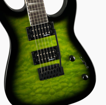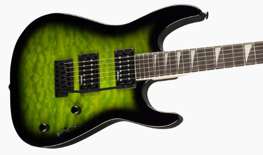 Jackson JS20 DKQ 2PT Transparent Green – электрогитара 6 струн, серии JS, форма корпуса – Dinky, материал корпуса – тополь с кленовым топом, гриф – клен с накладкой амарант, радиус накладки – 12"-16", лады 24 Jumbo, мензура – 25.5", звукосниматели (H-H) – Jackson High-Output, бридж – 2-Point Fulcrum Tremolo, цвет – зеленый.