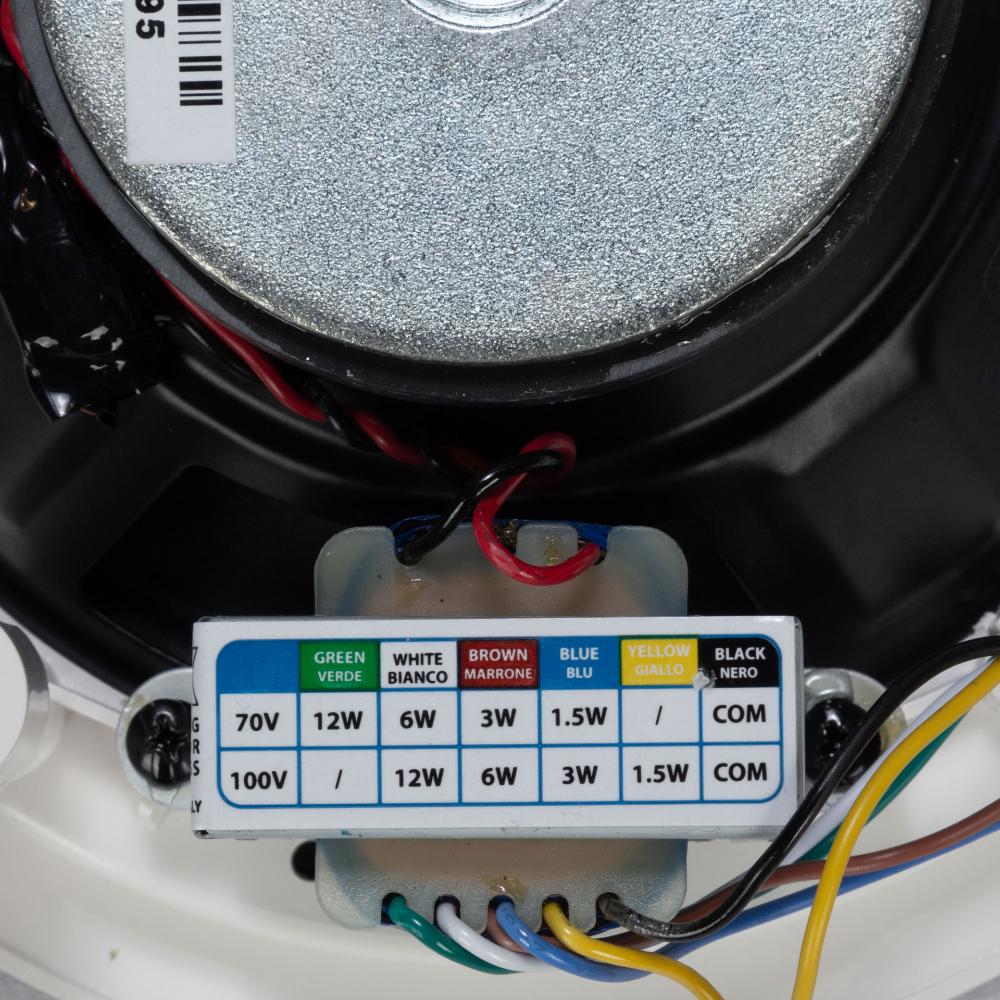 Встроенная потолочная акустическая система, 6" НЧ динамик и 1" купольный ВЧ твиттер. (70/100 В): 12 Вт, 6 Вт, 3 Вт или 1.5 Вт, чувствительность 92 дБ, максимальный уровень звукового давления 106 дБ, частотный диапазон 70-20 000 Гц, угол охвата 100°. Цвет черный RAL 9005