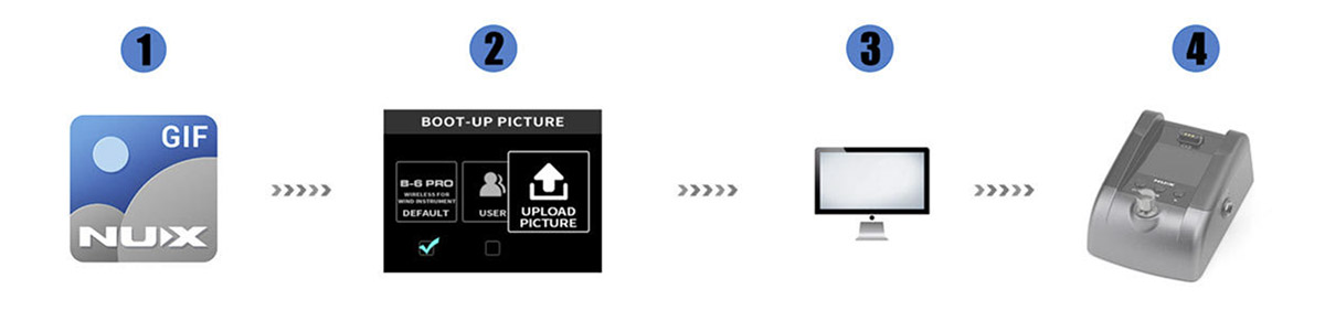 2. Подключите B-6 PRO RX (приёмник) к компьютеру с помощью прилагаемого USB-кабеля. Запустите программу GIF Customizer и следуйте инструкциям, чтобы загрузить и сохранить GIF-изображение на устройство.