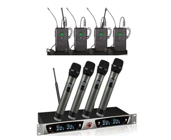 Четырехканальная беспроводная микрофонная система с ручными микрофонами, петличными микрофонами, наголовными гарнитурами (на каждый канал).