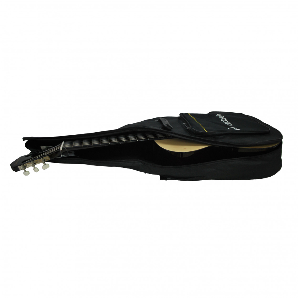 Чехол для 39-дюймовой классической гитары изготовлен с плотной, прочной ткани с водоотталкивающими свойствами – нейлон 600D. Имеет привлекательный дизайн и удобную форму. Оснащен 2 карманами. Также имеет боковую ручку для транспортировки гитары в руке и ручку на передней части чехла. Металлические молнии и подставка с ABS на нижней части чехла. Чехол надежно защитит Ваш инструмент от царапин и брызг воды. Подкладка из нетканого материала.