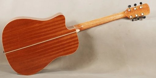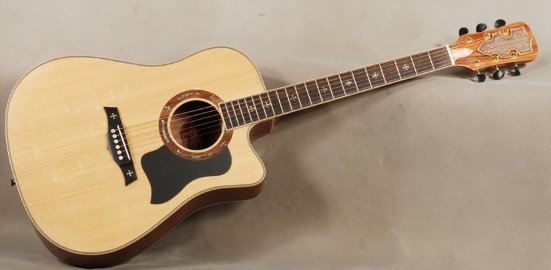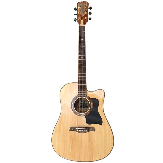 Акустическая гитара Dreadnought. Мензура: 650 Верхняя дека: ель. Задняя дека и обечайка: палисандр. Кант: -. Накладка грифа: палисандр. Литые колья. Регулируемый анкер. Инкрустация на грифе и розетке. Цвет: натуральный.