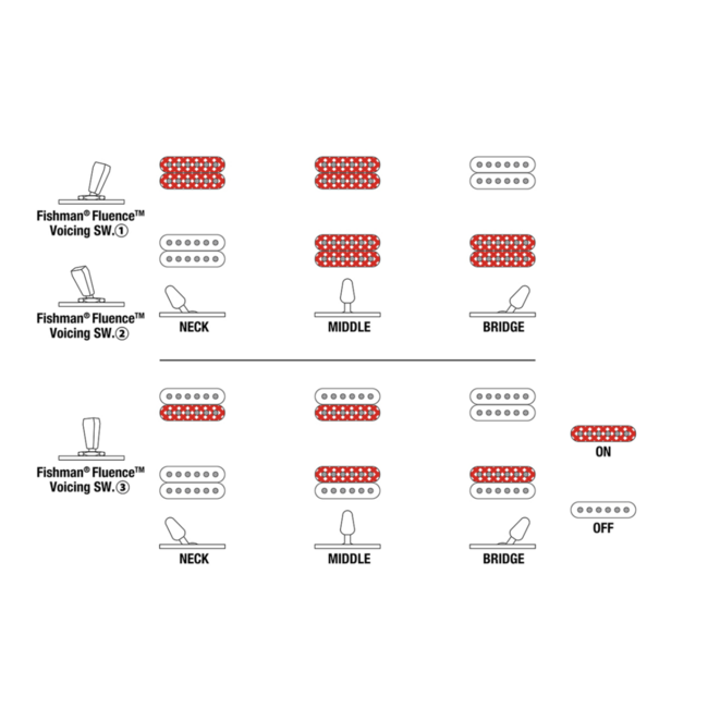 Гитара оснащена легендарными активными звукоснимателями Fishman Fluence Modern. Сочетание магнитов Alnico в нэковой позиции и Ceramic в бриджевой дает агрессивный, прорезающий тон без лишних шумов. С помощью переключателя Voicing switch вы можете мгновенно менять характер звучания: от современного активного саунда с мощным выхлопом до кристально чистого, детального и динамичного тембра.
