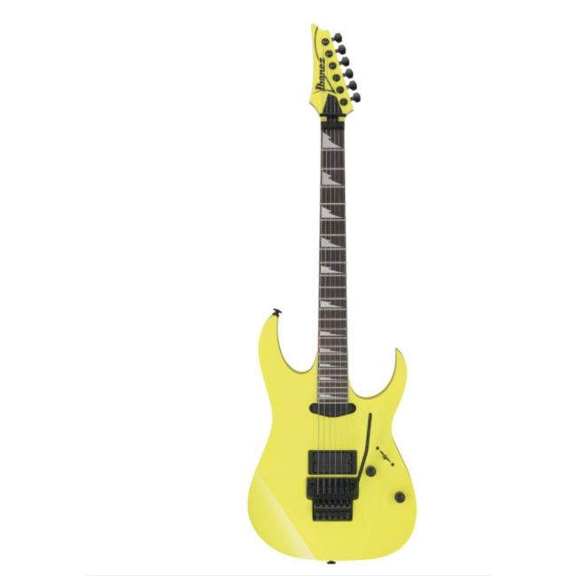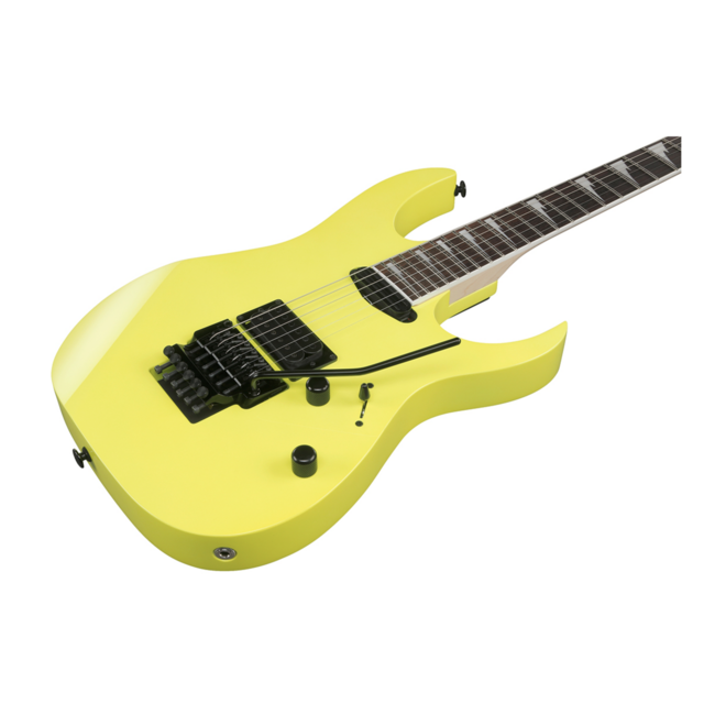 Ibanez RG565R DY – 6-струнная электрогитара, серия Genesis Collection, корпус – RG, материал корпуса – липа, гриф – 5-слойная конструкция из клена и ореха с накладкой из палисандра, профиль – Super Wizard, лады 24 Jumbo, мензура 25,5", звукосниматели (H-H) – Ibanez Infinity R/V8, бридж Edge Tremolo, черная фурнитура, цвет – желтый, произведена в Японии.