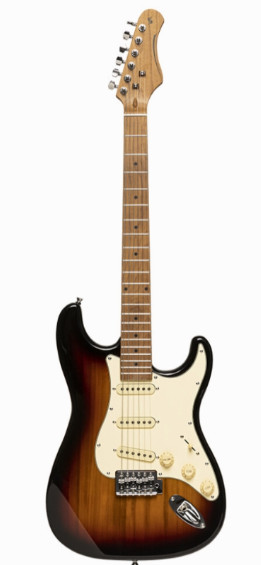 STAGG SES-55 – шестиструнная винтажная электрогитара серии «S» в корпусе типа «стратокастер» в классическом цвете. Корпус инструмента выполнен из массива павловнии. Гриф на болтовом креплении с легким доступом к последним ладам обладает матовой отделкой и сделан из клёна с кленовой накладкой. У гитары 22 лада, маркеры ладов выполнены в виде черных точек.