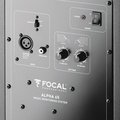 FOCAL ALPHA 50 - монитор ближнего поля, мощность НЧ - 70 ВТ, ВЧ - 35 ВТ, класс AB, динамики 6,5 "НЧ + 1" ВЧ, 40Hz - 22kHz. Монитор FOCAL ALPHA 65 характеризуется одинаковой эффективностью как для инструментальной, так и для электронной музыки, а также отличается высокой адаптивностью. Материал корпуса - 15 мм MDF. Для удобства подключения является XLR балансный и RCA небалансный вход и переключатель чувствительности входа + 4/10. Также присутствует режим standby после 30 минут отсутствия сигнала. Усилитель в классе AB. Есть два фильтра на краях частотного диапазона.
