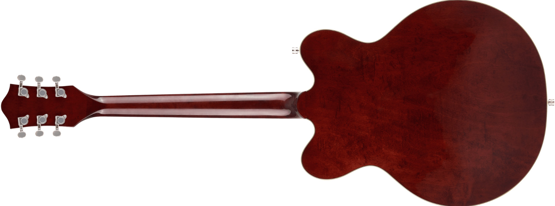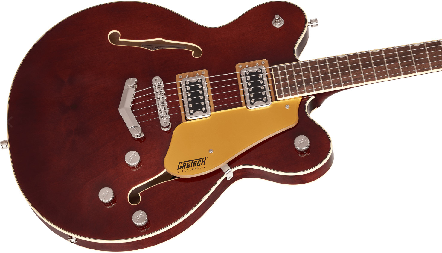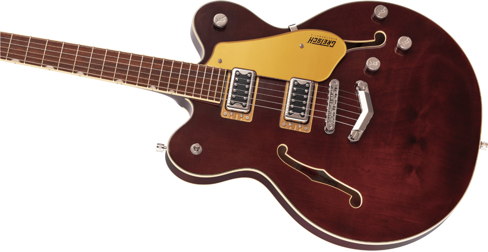 Другие особенности GRETSCH G5622 ELECTROMATIC CENTER BLOCK DOUBLE-CUT WITH V-STOPTAIL AGED WALNUT включают бридж Anchored Adjusto-Matic, верхний порожек Graph Tech NuBone и ручки потенциометров G-arrow.