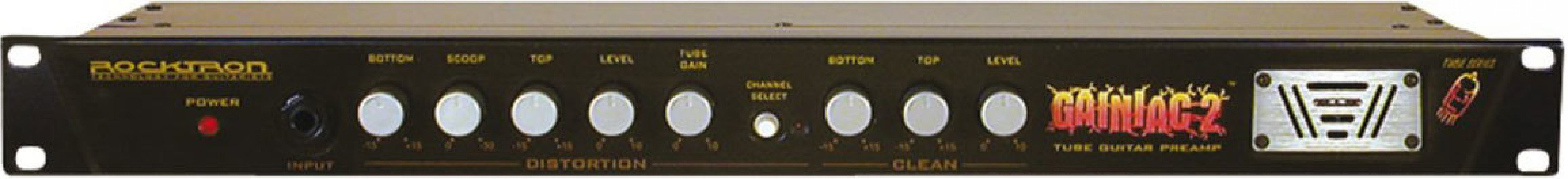 Гитарный предусилитель Rocktron Gainiac 2 имеет два канала, инструментальный вход (джек), переключатель каналов, светодиодный индикатор питания, линейный выход (джек), разъем для педального переключателя, разъем питания. На одном канале, в работающем режиме перегруза, то есть регуляторы чувствительности, уровня, трехполосный эквалайзер (регулятор тембра средних частот действует только в сторону ослабления, в узкой полосе), светодиодный индикатор активности канала. На другом канале, работающем с чистым звуком, есть трехполосный эквалайзер и регулятор уровня. В конструкции используется одна лампа типа 12AX7. Питание осуществляется от адаптера. Устройство выполнено в однорэковом корпусе.