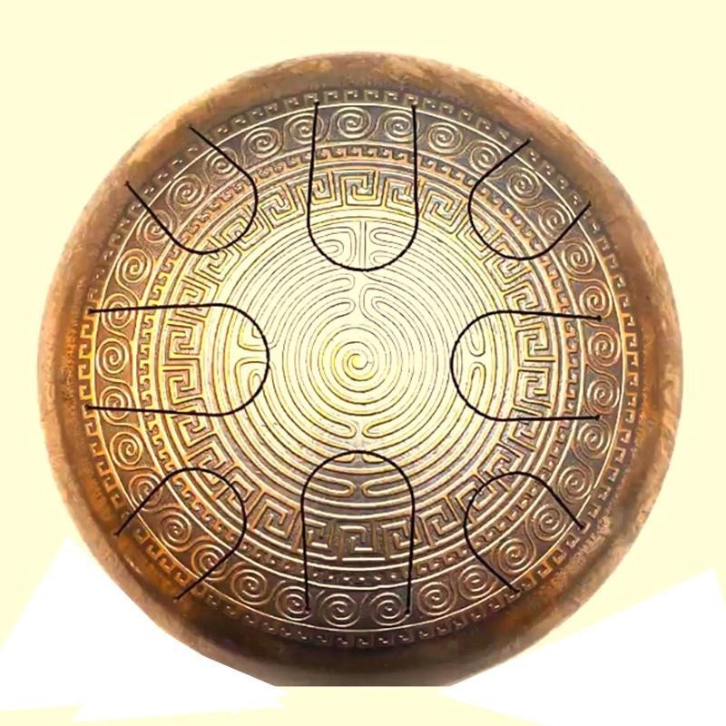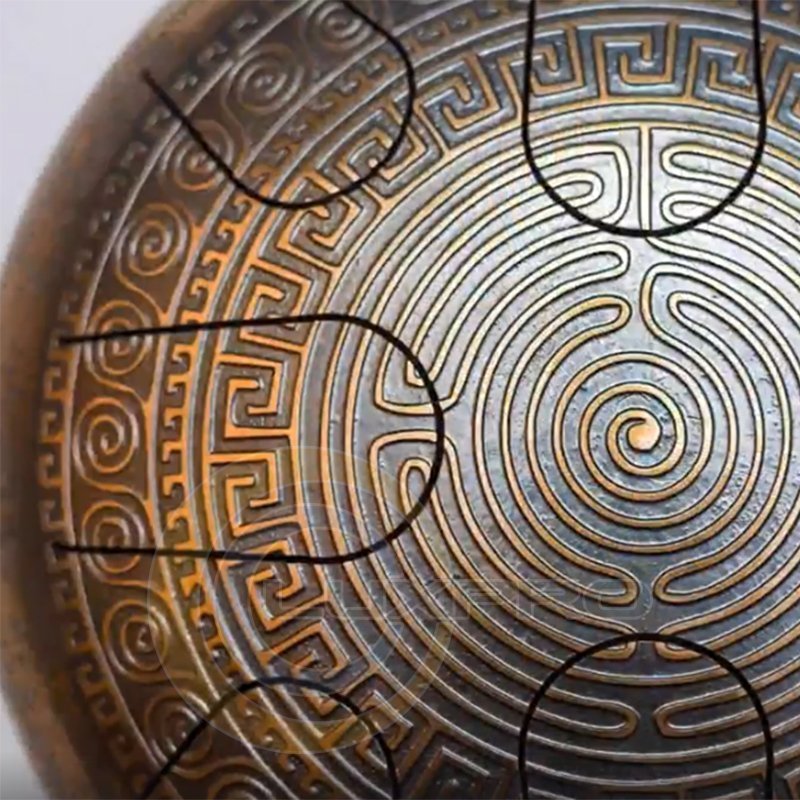 Инструмент золотистого цвета с покрытием хамелеон, 8 симметричных лепестков, 8 нот. Диаметр составляет 34 см, глюкофон сделан из двух частей.