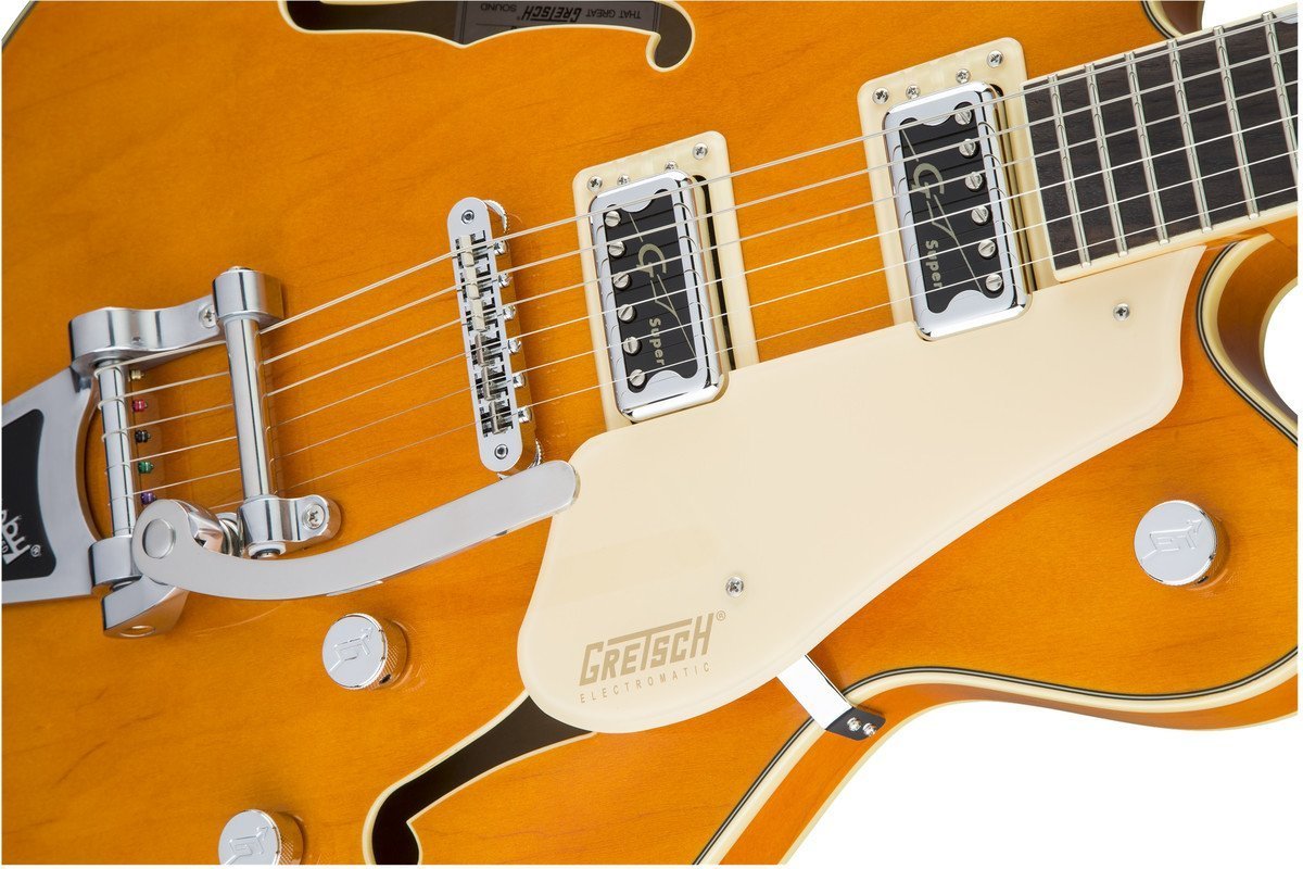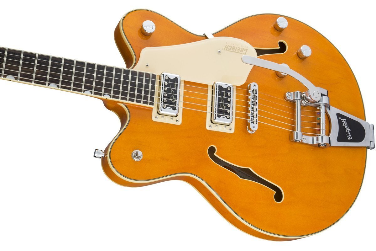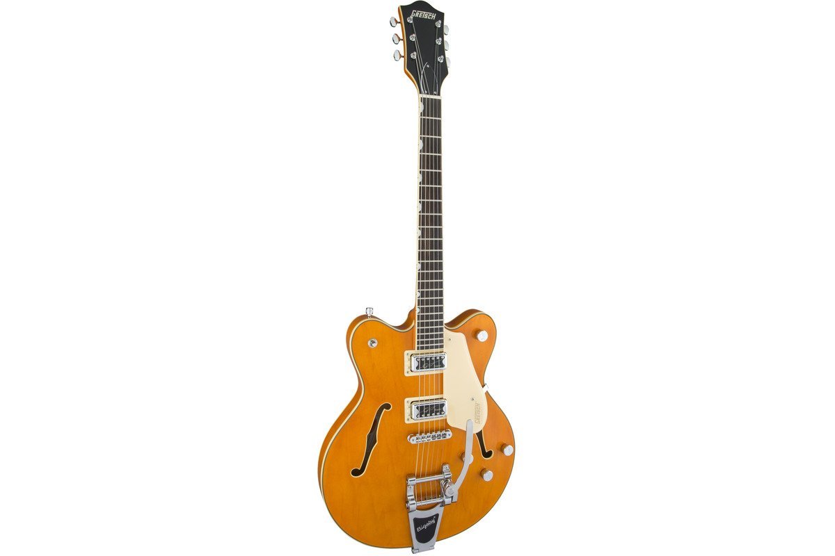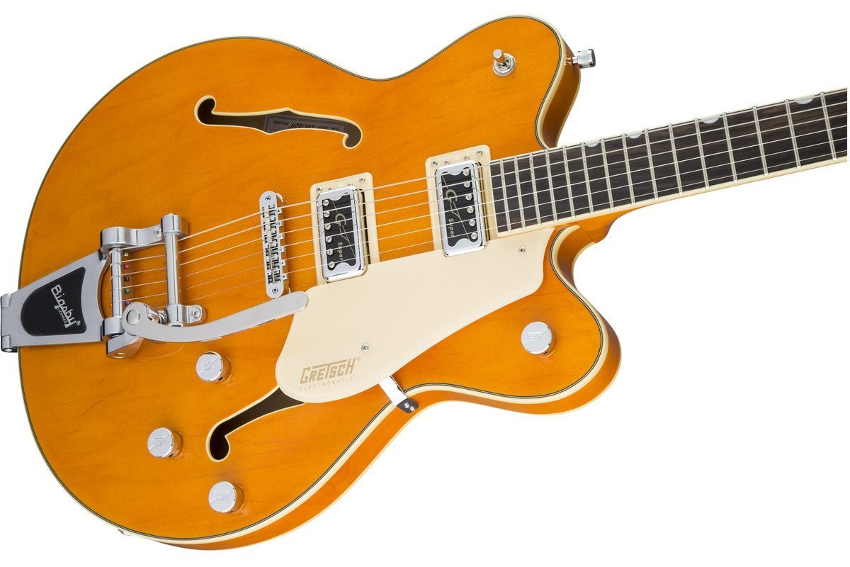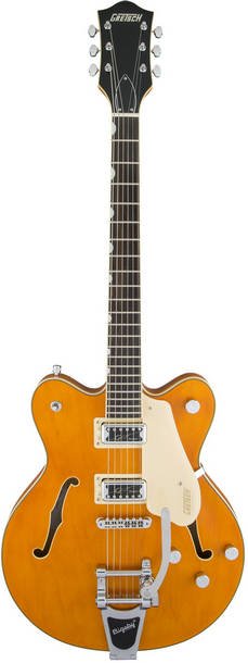 GRETSCH G5622T ELECTROMATIC CENTER BLOCK RW VINTAGE ORANGE w / Bigsby - полуакустическая гитара с центральным блоком, тремоло системой и 2 вырезами. Громкие и энергичные инструменты серии Electromatic c еловым центральным блоком созданы для получения чистого и мощного звука на большой громкости.