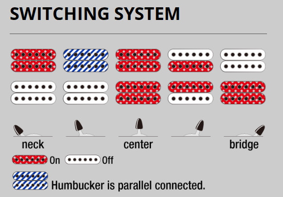 С целью упростить инструмент и сделать его более прямолинейным, RG421EX был оборудован двумя хамбакерами без уже ставшего традиционным сингла в средней позиции. Однако при этом тембральное богатство никоим образом не пострадало: 5-позиционный переключатель звукоснимателей предлагает получить такие нестандартные комбинации, как последовательное подключение двух катушек бриджевого и синглового звукоснимателя, а также параллельное подключения катушек нэка!