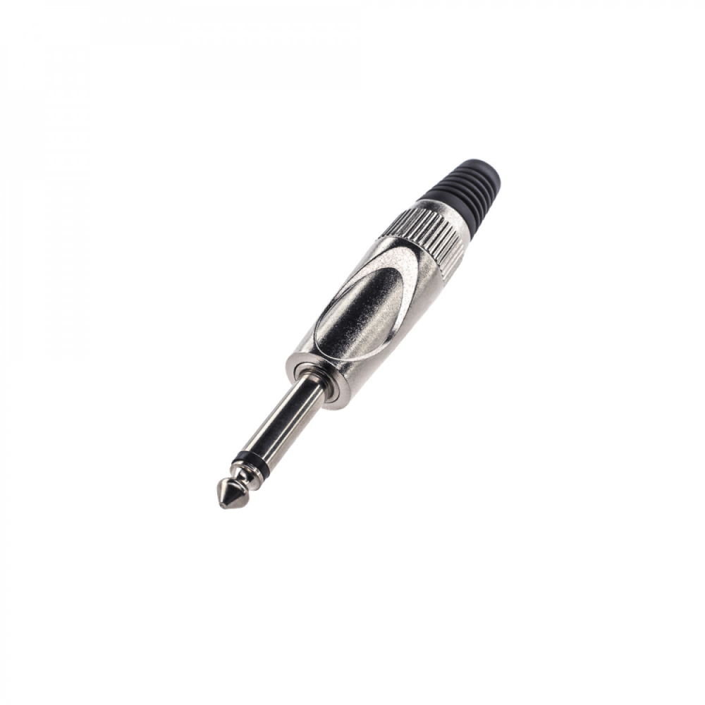 Maximum Acoustics JM65 - 6,3 мм (1/4") моно разъем с посеребренными контактами, металлический корпус и резиновый держатель кабеля. Цвет - металлик (корпус) / черный (держатель кабеля).