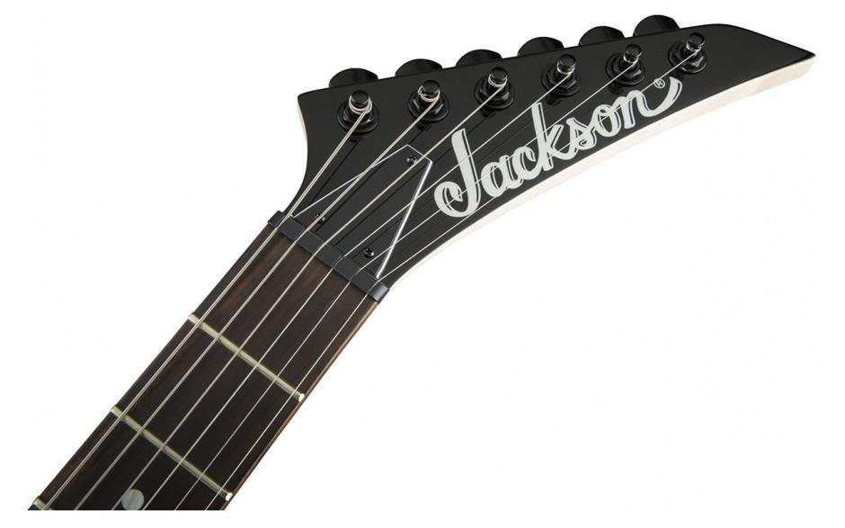 JACKSON JS22 DINKY AH SBK имеет полностью черную фурнитуру, включая бридж 2-Point Fulcrum Tremolo, пуговицы для крепления ремня и литые колки.