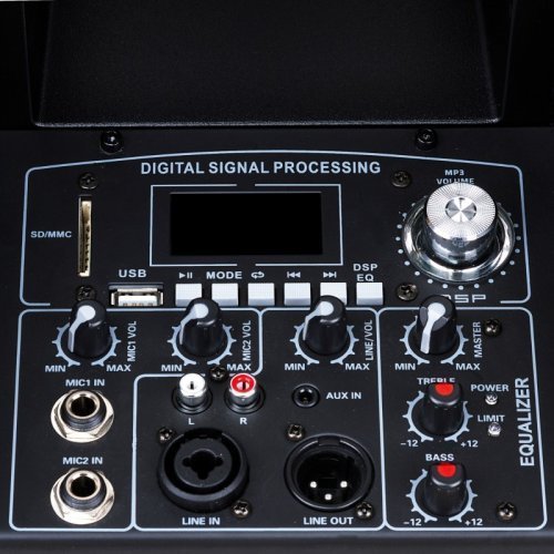 Секция микшера имеет 2-полосный эквалайзер с регулятором общей громкости и отдельные регуляторы громкости для микрофонов и линейного входа. Регулятор громкости MP3-плеера также выполняет функцию контроля DSP.