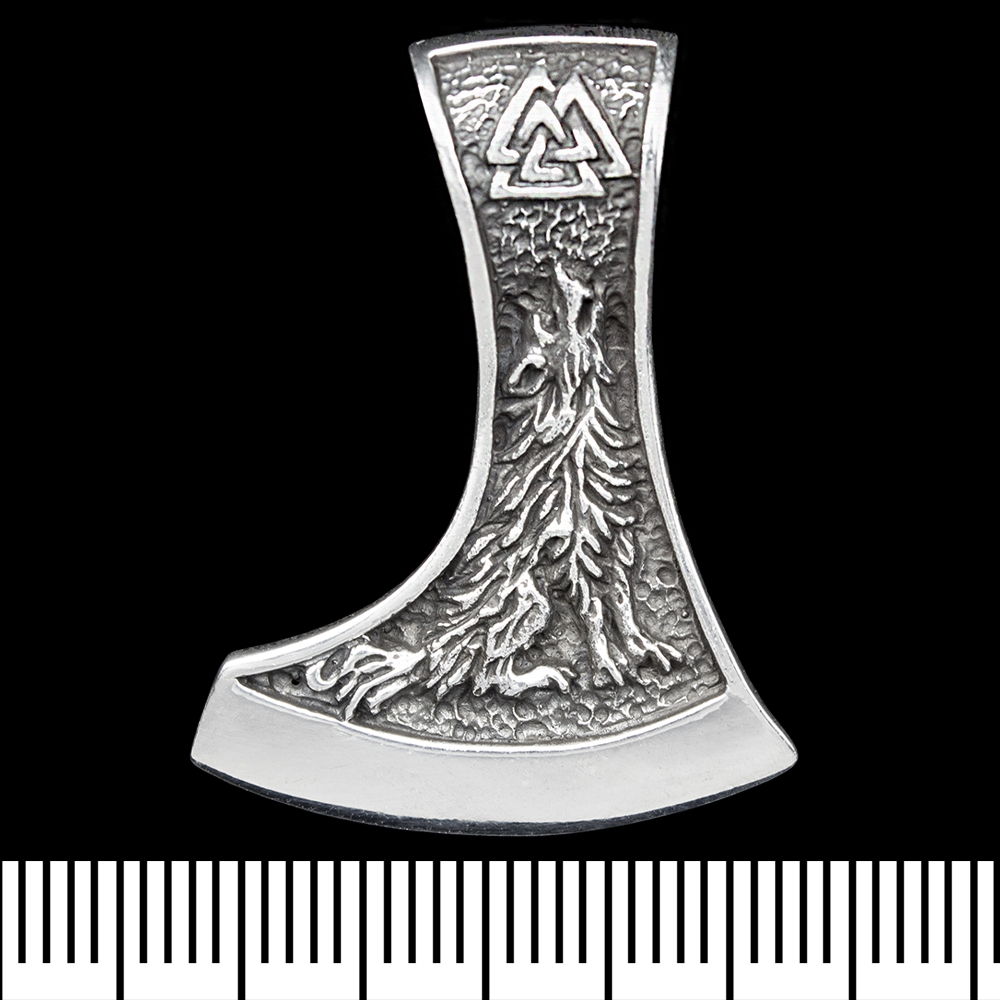 Кулон Сокира Перуна з вороном та вовком (срібло, 925 проба) (sp-226) 7,5 грам, висота 33 мм, ширина 24 мм, розмір вушка для ланцюжка 8х5 мм