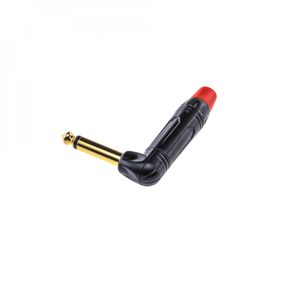 Maximum Acoustics JMRG.BL - 6,3 мм (1/4") моно разъем под углом 90° с позолоченными контактами, металлический корпус и резиновый держатель кабеля. Цвет - черный (корпус) / красный (держатель кабеля).
