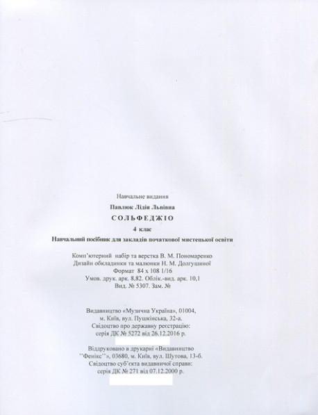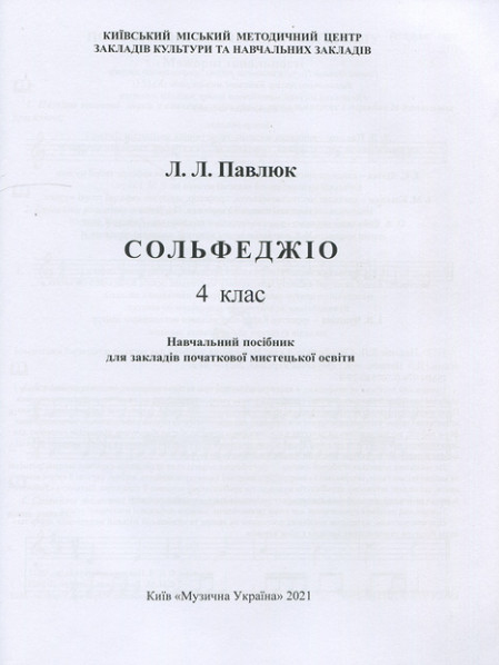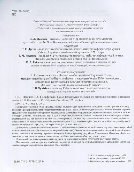 Навчальний посібник "Сольфеджіо. 4 клас" укладено для практичного засвоєння учнями програми 4 класу і здобуття необхідних компетентностей (комбінації знань, умінь, навичок) для активної творчої діяльності учнів. Продовжуючи традицію попередніх видань, автор спирається на українські, європейські народнопісенні та композиторські твори. Усі приклади зручні для інтонування, вони можуть бути стимулом для нових імпровізаційних форм роботи, що так важливо на заняттях з сольфеджіо. Посібник суттєво збагачують підрозділи "сторінка для допитливих", де в простій та дотепній формі викладено додатковий матеріал (головні та побічні акордові функції, акорди нетерцієвої структури, кластери, типи фактури та інше).