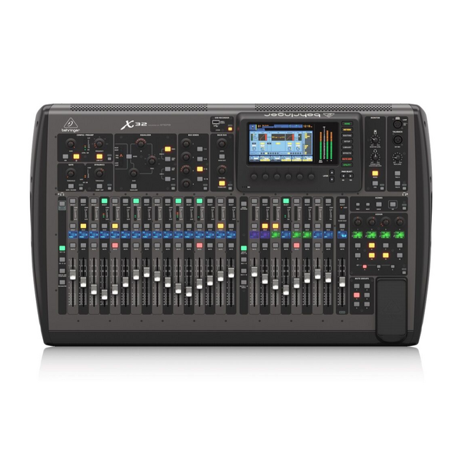 Behringer X32 — 32-канальный цифровой микшерный пульт с полностью программируемыми микрофонными предусилителями класса high-end и 16 микширующими шинами, конфигурируемыми как подгруппы. Пульт отличается наличием 32-битного процессора DSP с широким динамическим диапазоном и имеет 25 моторизованных фейдеров.