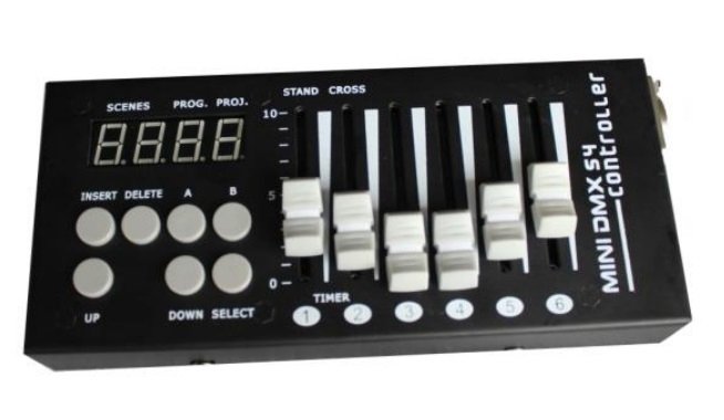 Emiter-S DMX-54 - контроллер DMX512, 54-канальный DMX-выход, 9 приборов по 6 каналов, 9 программ, каждая программа с 50 сценами, 4-битный светодиодный дисплей. Сцена, управляющая время и скоростью. Питание и память, функция автоматической работы программы. Выходные 3-контактные разъемы XLR.