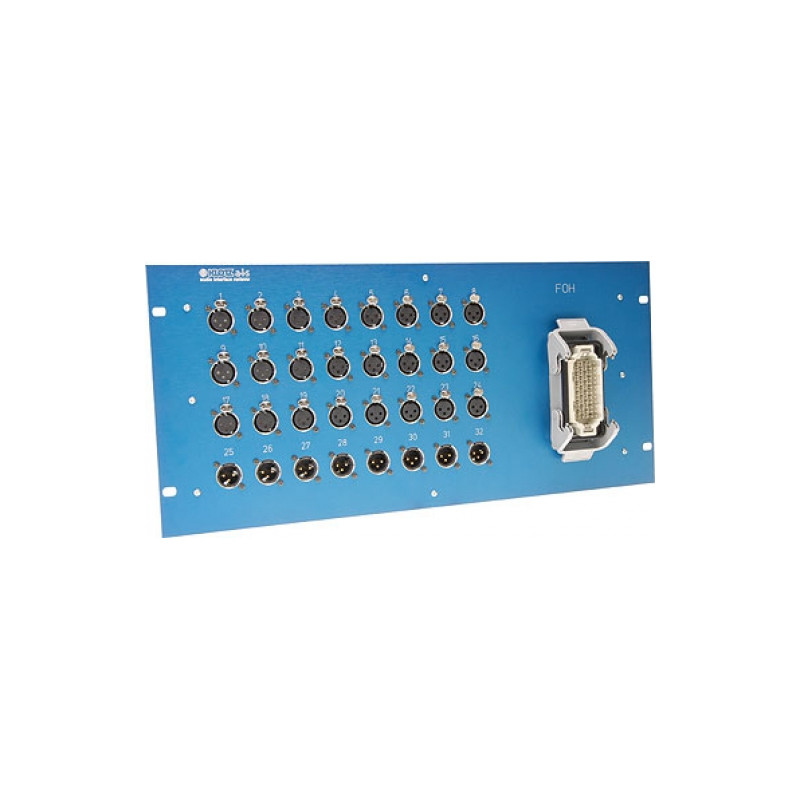 KLOTZ 193208H2G – рэковый мультикор 32 входа XLR, 8 выходов XLR, 2 мультипиновых разъема Harting, общее заземление.