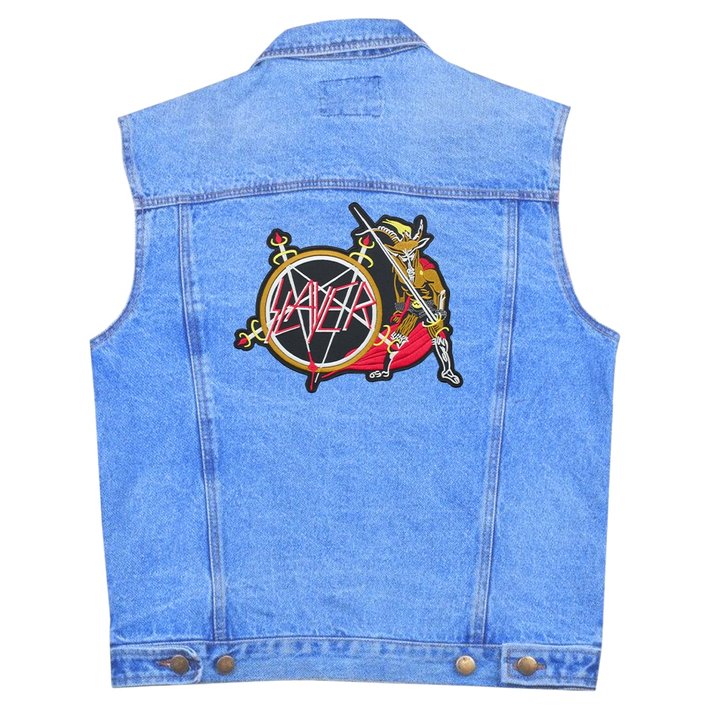 Нашивка термо Slayer (logo and goat with sword) наспинна (thps-012) Розмір – ширина 22 см, висота 18 см Високоякісна термонашивка з деталізованою машинною вишивкою. Виробництво: Таїланд. Спосіб застосування: зі зворотного боку нашивки знаходиться термоплівка. На рівну розгладжену тканину до розміченої області прикладіть термонашивку, з вивороту або через тонку тканину (наприклад марлю) із зовнішньої сторони прогладьте попередньо розігрітою праскою. Особливу увагу приділіть кутам та краям. Увага: дотримуйтесь температурного режиму для тканини на яку закріплюватимете нашивку, щоб не пошкодити виріб.