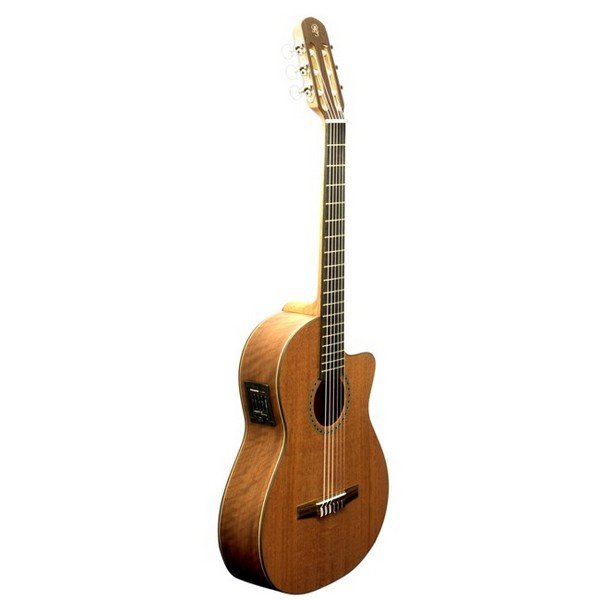 Верхняя Дека: цельное красное дерево. Нижняя дека и обечайка: древесина ukola. Гриф: кедр (с анкером). Накладка: изогнутое черное дерево. Колки: Колковая механика - никелированная. Подставка: палисандр. Отделка: матовое. Звукосниматель: fishman. Производство: Испания.