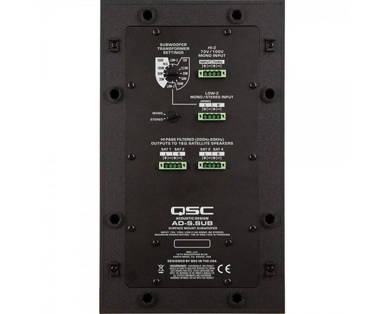 Настенная АС (сабвуфер), 6,5" с двойной обмоткой, RMS/Program - 100/200Вт - 4Ом, 70/100В (100, 50, 25, 12,5 Вт), SPL 106 дБ (рассчетный пик @ 1 м), чувствительность (1Втх1м) 86 дБ, 55 - 150 Гц, моно-вход (4-контактный разъем Euroblock с выходом thru), Low-Z вход (4-контактный разъем Euroblock, левый (моно) и правый), моно-выход hi-pass (2 4-контактных разъема Euroblock для 4 сателитов), 10,7 кг, IP-34, цвет - черный.