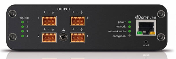 Cетевой аудио интерфейс SHURE ANI4OUTBLOCK Технические характеристики: Фантомное питание: Выбирается для канала - +48 В Логические разъемы: Sent as Ethernet command strings - LED, Switch Полярность: Неинвертирующий, любой вход на любой выход Выход: 1 х RJ45 Требования к питанию: Питание через Ethernet (PoE), класс 0 Потребляемая мощность: 10 Вт, максимальная Требование к кабелю: Cat5e или выше (рекомендуется экранированный кабель) Частотная характеристика: От 20 до 20.000 Гц Цифровой выход Dante: Количество каналов: 4 Частота дискретизации: 48 кГц Разрядность: 24 Динамический диапазон (Analog-to-Dante): 20 Hz to 20 kHz, A-weighted, typical, 113 dB Эквивалентный шумовой входной сигнал: 20 Hz to 20 kHz, A-weighted, input terminated with 150Ω Настройка аналогового усиления = +0 дБ: -93 дБВ Настройка аналогового усиления = +27 дБ: -119 дБВ Настройка аналогового усиления = +51 дБ: -130 дБВ Суммарные гармонические искажения: При 1 кГц, 0 дБВ вход, аналоговое усиление 0dB: <0,05% Импенданс: 5 кОм Конфигурация входа: Активный балансный Встроенный цифровой процессор обработки сигналов: На канал - эквалайзер (4-полосный параметрический), приглушение, инвертирование Полярность, усиление (диапазон 140 дБ) Системное суммирование аудиосигнала Масса: 672 г (1.5 lbs) Габаритные размеры (В х Ш х Г): 4 x 14 x 12,8 см (1.6 x 5.5 x 5.0 in.) Рабочая температура: −6,7°C до 40°C