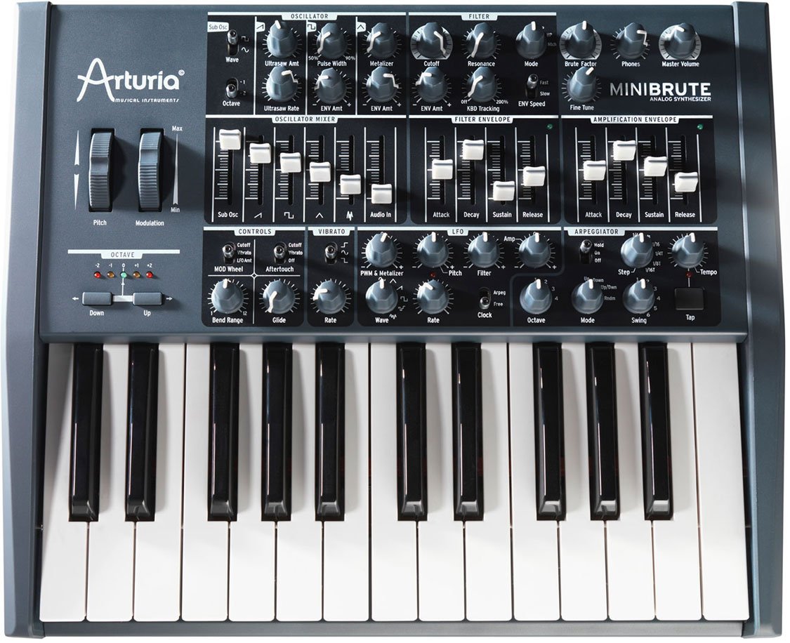 ARTURIA Minibrute клавишный двухоктавный аналоговый синтезатор оснащен динамической клавиатурой с послекасанием, колесами модуляции, арпеджиаторов, CV-управлением. Уникальный по размерам, доступности, коммутационным возможностям и patchability способностям служить CV-контроллером для аналоговых CV-систем.