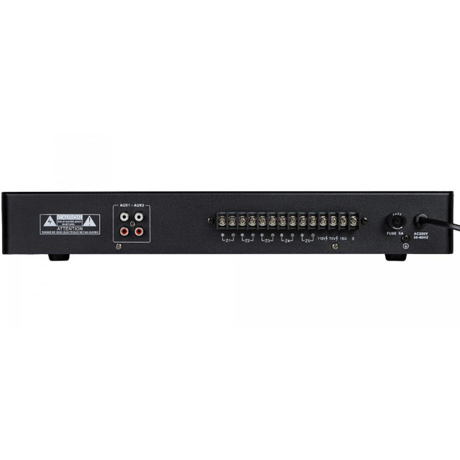 Усилитель предлагает два типа подключения АС: первый с повышающим напряжение трансформатором для уменьшения потери аудио сигнала при подключении к линии трансляции напряжением 100В/70В, а второй для подключения "низкоомных" 4-16 Ом акустических систем.
