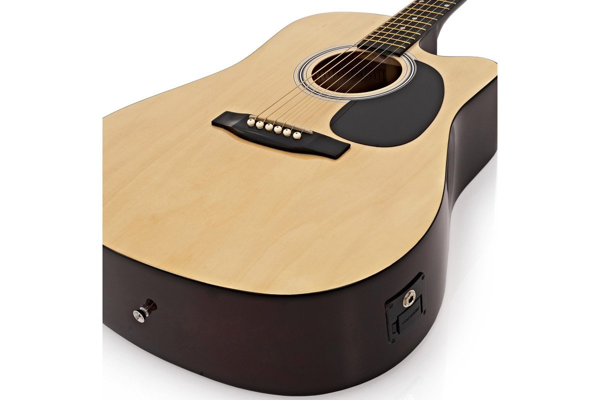 Электроакустическая гитара, 6 струн, форма - дредноут, верхняя дека - ламинированный Хардвуд, нижняя и боковая часть - ламинированный махагони, гриф - нато / Харвуд, преамп - Fishman Presys, цвет - натуральный.