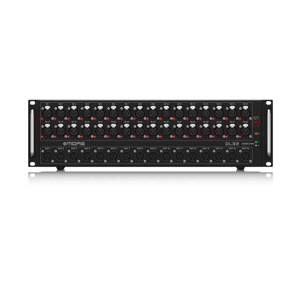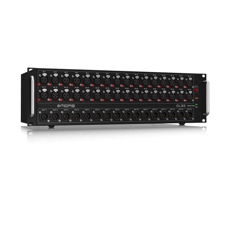 Цифровой стейджбокс MIDAS DL32 — инструмент для связи Front Of House со сценой. Прибор включает 16 симметричных XLR-выходов и 32 микрофонных предусилителя. Одним кабелем подключают до трех устройств, значительно увеличив количество входных и выходных каналов.