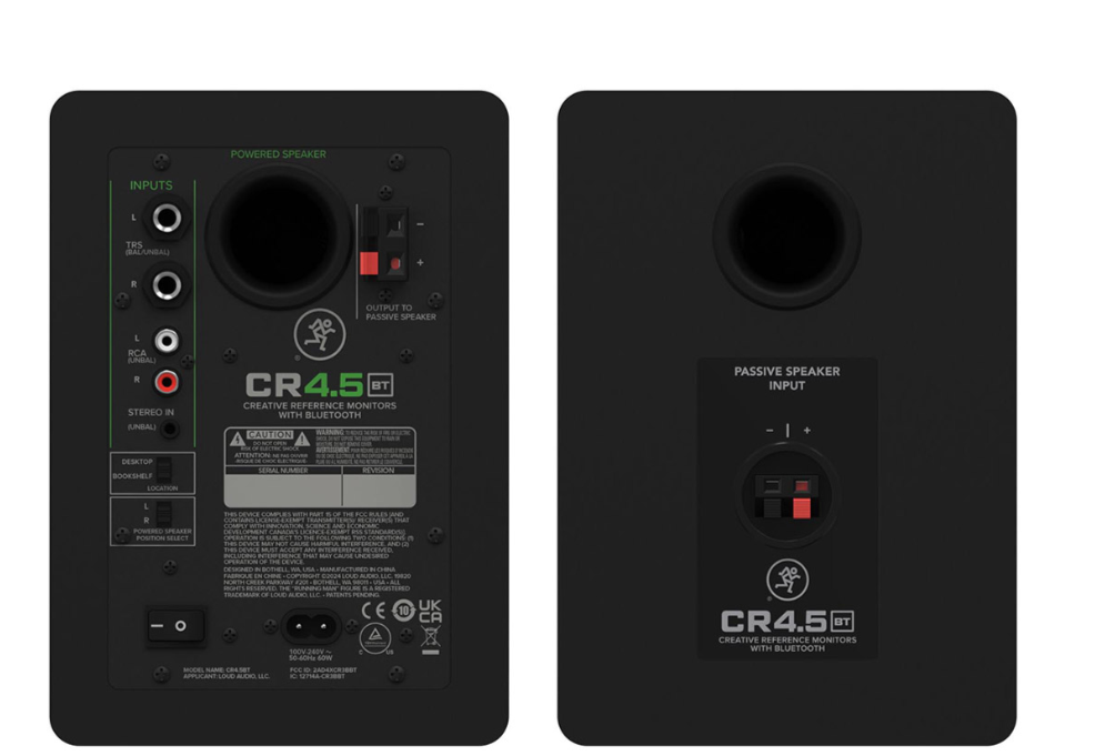Mackie CR4.5BT Gen 3 – пара активных студийных мониторов, динамик 4.5", Bluetooth: 5.0, регулировка тона, переключатель режимов (стол/подставка), входы: TRS, RCA, 3.5 мм, выход на наушники, шелковый твитер, тканевый вуфер, мощность 50 Вт, частотный диапазон 65 Гц - 20 кГц (-3 дБ), максимальный SPL: 101 дБ, частота кроссовера 3 кГц, выходное сопротивление 10 кОм, цвет черный.