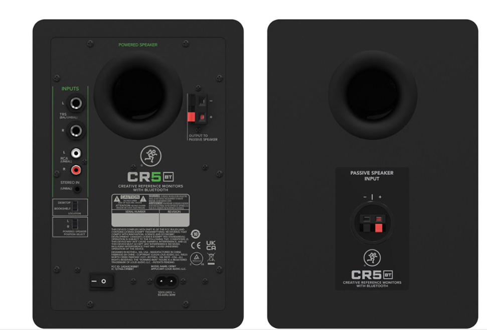 Mackie CR5BT Gen 3 – пара активных студийных мониторов с Bluetooth, динамик 5.25", регулировка тона, переключатель режимов (стол/подставка), входы: TRS, RCA, 3.5 мм, выход на наушники, шелковый твитер, тканевый вуфер, мощность 100 Вт, частотный диапазон 59 Гц - 20 кГц (-3 дБ), максимальный SPL: 105 дБ, частота кроссовера 3 кГц, выходное сопротивление 10 кОм, цвет черный.