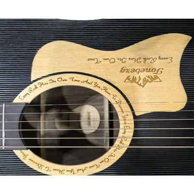 Розетка оформлена декоративными элементами с выжженным текстом и дополнена двумя художественными вставками, выполненными в той же технике выжигания. Такое решение придаёт инструменту индивидуальность, сохраняя визуальный баланс. Светлые акценты на деке гармонично контрастируют с тёмным фоном и делают дизайн запоминающимся.