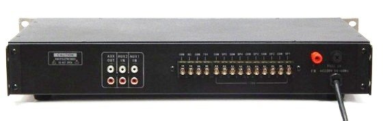 так и в низкоомными режиме от 4 до 16 Ом. В режиме 100 Вт имеет выходы на 5 зон, причем каждая из зон имеет независимый выключатель на передней панели микшера-усилителя. Еще одним преимуществом данного прибора является встроенный USB MP3 проигрыватель и FM-тюнер