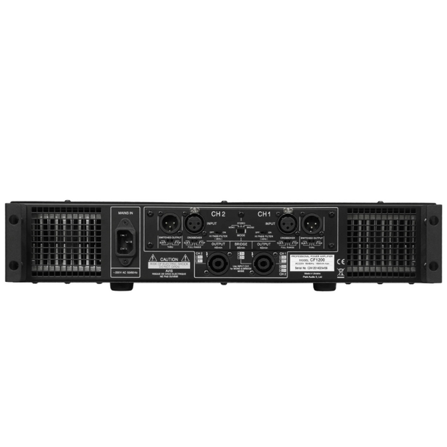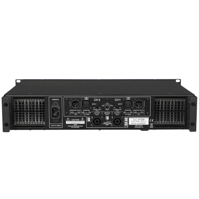 СF-серия – это коммерческая серия профессиональных усилителей мощности. Подгруппа CF900-2400 имеет встроенный кроссовер с переключаемым линейным выходом. По сопротивлению нагрузки усилители имеют только одно исполнение — для нагрузки 4 Ома (кроме усилителя CF2400), который имеет два исполнения – для нагрузки 4 Ома и 2 Ома. Импульсный источник питания позволил заметно снизить вес по сравнению с усилителями с классическими трансформаторными источниками питания. Профессиональные усилители мощности серии CF предназначены для высококачественного усиления сигналов звуковой частоты в составе комплекса профессиональной звукоусилительной аппаратуры. Усилитель Park Audio CF1200 высотой 88 мм (2U). Конструкция усилителя предусматривает установку его в стандартную стойку (Rack 19"). Охлаждение выходного каскада усилителя осуществляется вентиляторами. Система охлаждения независимая для каждого канала. Направление потока воздуха – от передней панели к задней. С ростом выходной мощности и, как следствие, ростом температуры транзисторов выходного каскада происходит плавное увеличение скорости потока охлаждающего воздуха и соответственно интенсивности охлаждения. Конструктивно усилитель состоит из: источника питания, двух одинаковых моноблоков усиления, входного блока и блока индикации. Входной блок усилителя сменный.