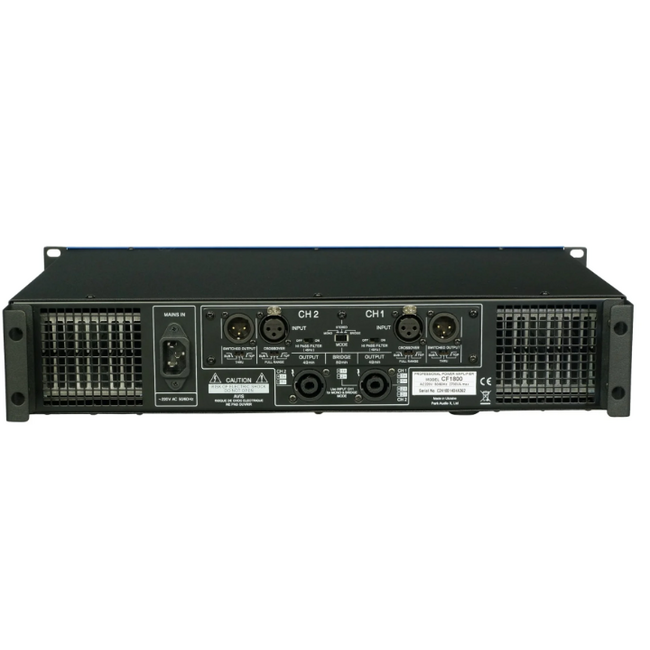 Усилитель Park Audio CF1800 выполнен в металлическом (стальном) корпусе высотой 88 мм (2U). Конструкция усилителя предусматривает установку его в стандартную стойку (Rack 19"). Конструктивно усилитель состоит из: источника питания, двух одинаковых моноблоков усиления, входного блока, блока индикации и регуляторов уровня входного сигнала. Входной блок усилителя сменный. В базовой модели применен входной блок с кроссовером, позволяющим независимо устанавливать соответствующую частотную полосу (Low, High, Full Range) как для самого усилителя (отдельно для каждого канала), так и частотную полосу сигнала, подаваемую на линейный выход (также отдельно для каждого канала).