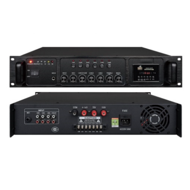 2 микрофонных входа (MIC 1 с функцией бесшумного подключения, удобно для экстренного оповещения), 3 аудиовхода, 1 аудиовыход с регулировкой высоких и низких частот, 6 выходов, независимая регулировка громкости каждого выхода