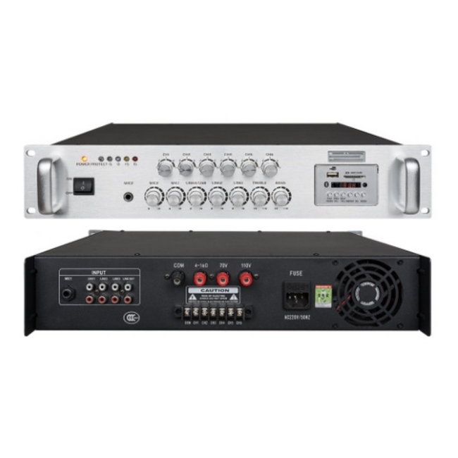 2 микрофонных входа (MIC 1 с функцией бесшумного подключения, удобно для экстренного оповещения), 3 аудиовхода, 1 аудиовыход с регулировкой высоких и низких частот, 6 выходов, независимая регулировка громкости каждого выхода