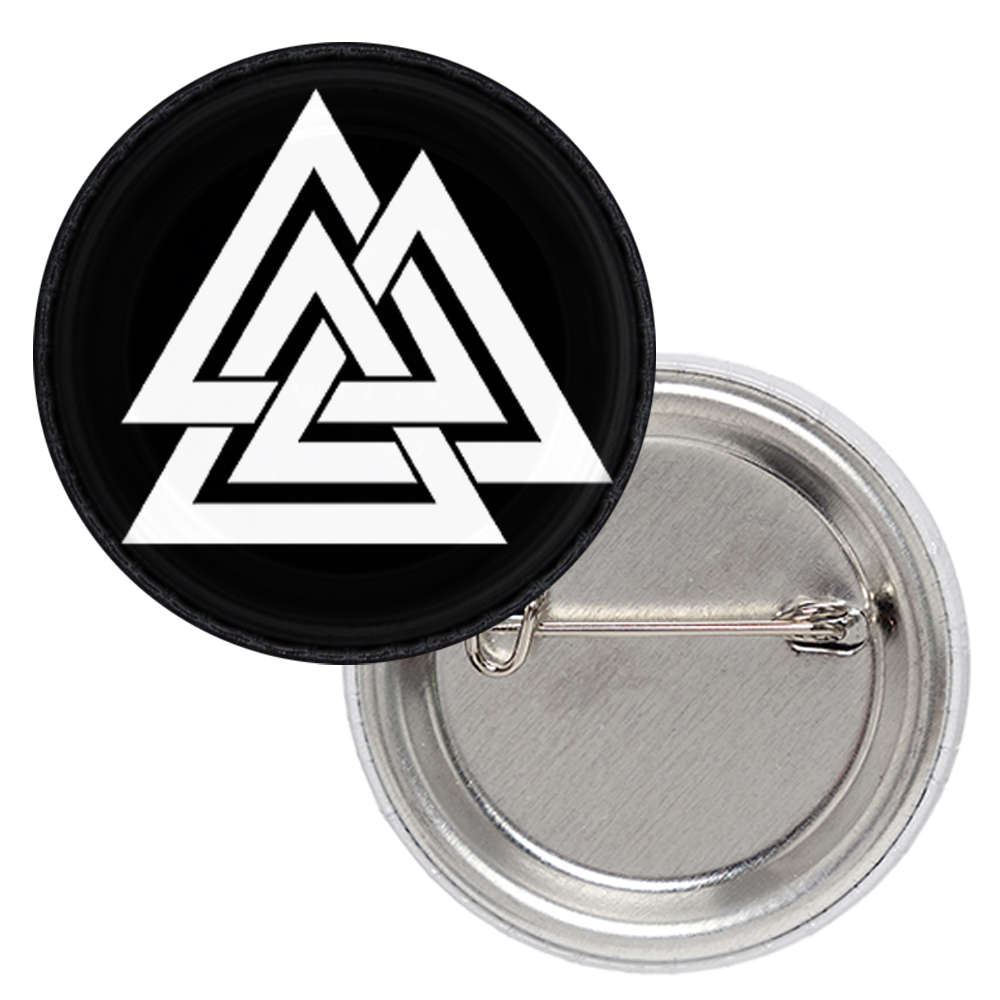 Значок Валькнут (черный фон) Материал: Металл. Диаметр: 25 мм. Значок закатной. Выполнен на металлической основе. Изображение покрыто специальной плотной пленкой, которая защищает его от повреждений, влаги, а также стирания. Округлая форма значка, метод изготовления, а также покрытие придают объем изображению на значке.