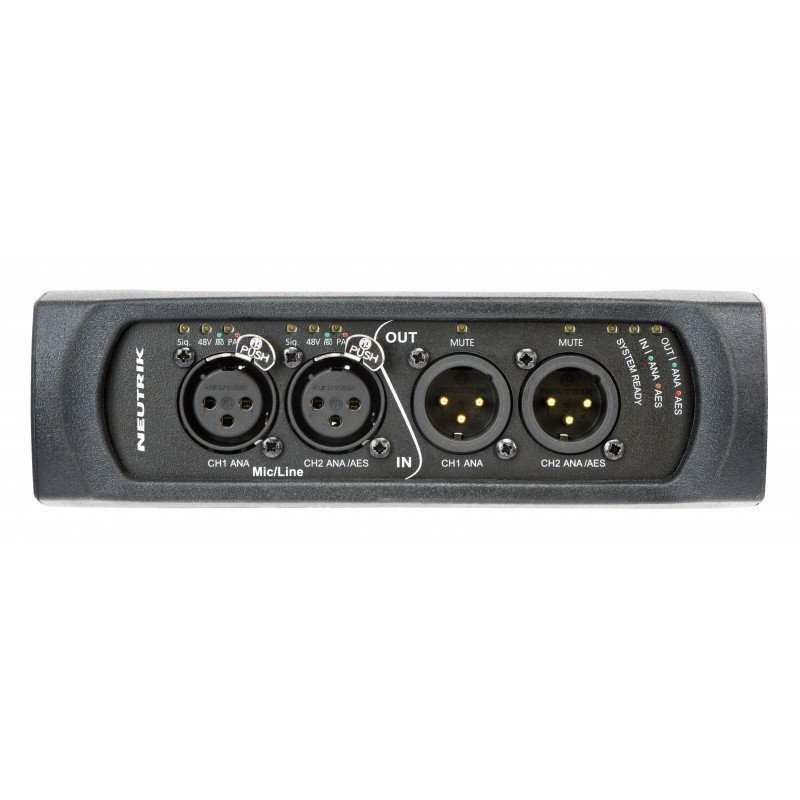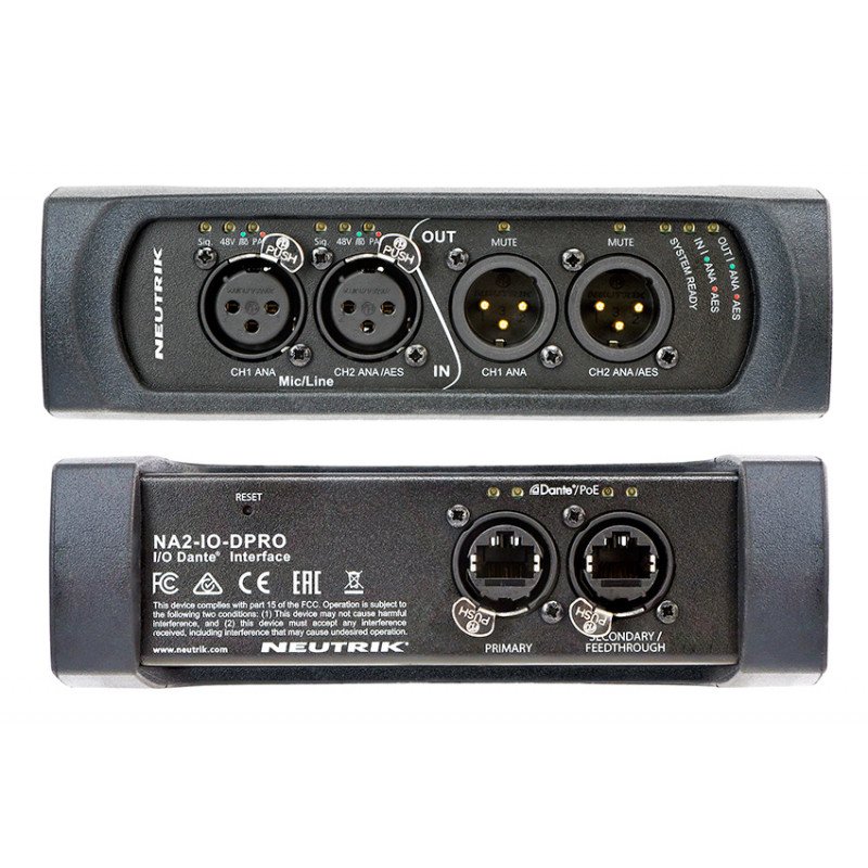 NEUTRIK NA2-IO-DPRO - интерфейс ввода / вывода (2IN / 2OUT) аналоговых аудио сигналов в сети Dante ®. Оснащен высококачественными микрофонными предусилителями и 2 портами Dante ® для резервной настройки или последовательного подключения. Параметры звука настраиваются приложением DPRO Controller. Коммутационный блок разработан для суровых условий сцены, в случае стационарного применения резиновая защита коробки можно снять. С помощью дополнительных монтажных кронштейнов или рэковый панели 19 ", коробка может быть установлена под столами, в напольных коробках или в стойках для оборудования.