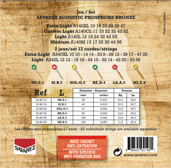 Струни виготовлені з фосфор бронзи, що дозволяють розкрити тон вашого інструменту на максимум. Яскравий та впізнаваний тон струн від SAVAREZ став вибором багатьох відомих музикантів.