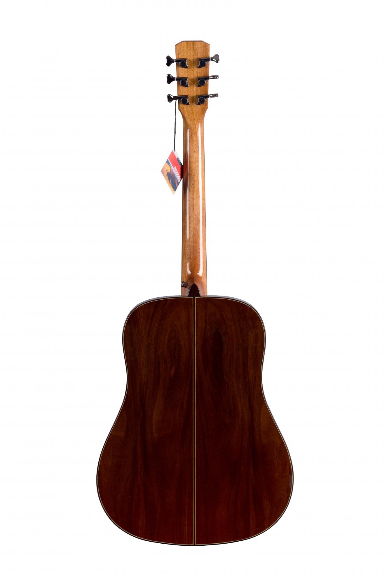 Акустична гітара Prima MAG218 виготовлена з відбірних матеріалів, що забезпечують чисте звучання з багатими обертонами. Топ з цільної ситхінської ялини та корпус з палісандра Santos у поєднанні з корпусом Dreadnought створюють об'ємне звучання з вираженою серединою та яскравими верхами. Гітара вкрита тонким шаром глянцевого лаку. Виглядає розкішно.