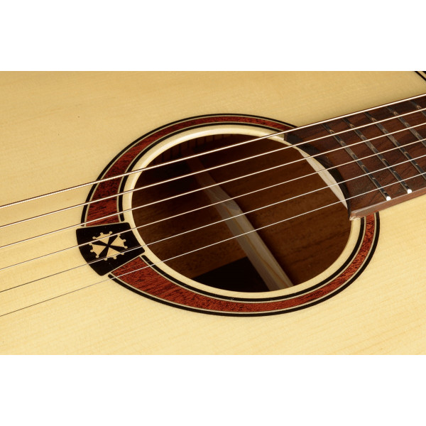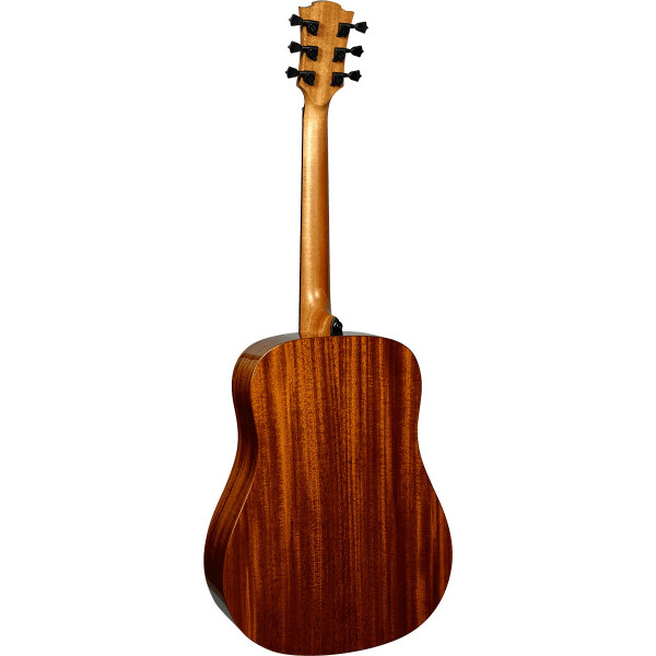 Акустична гітара форми дредноут. Нижня дека, обичайки та гриф – з тропічної хайї. Ця гітара має 20 ладів, графітові верхній та нижній поріжок. Механіка – лита, чорна.